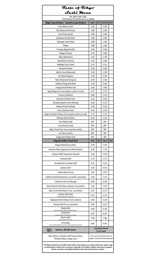 Welcome to Taste of Tokyo Buffalo Grove, an authentic Japanese dining experience located at 159-163 McHenry Rd. This beloved sushi spot offers a captivating kaiten-zushi (conveyor belt sushi) concept, where you can delight in visually stunning dishes served on charming boats. The menu features an impressive array of options ranging from classic sushi rolls like the California Roll and Spicy Salmon Roll to unique specialties such as the Mchenry Roll and the indulgent Godzilla Roll.